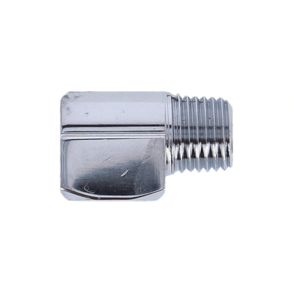 Adapter oil line fitting, 90 degrees. 1/4" NPT. Chrome