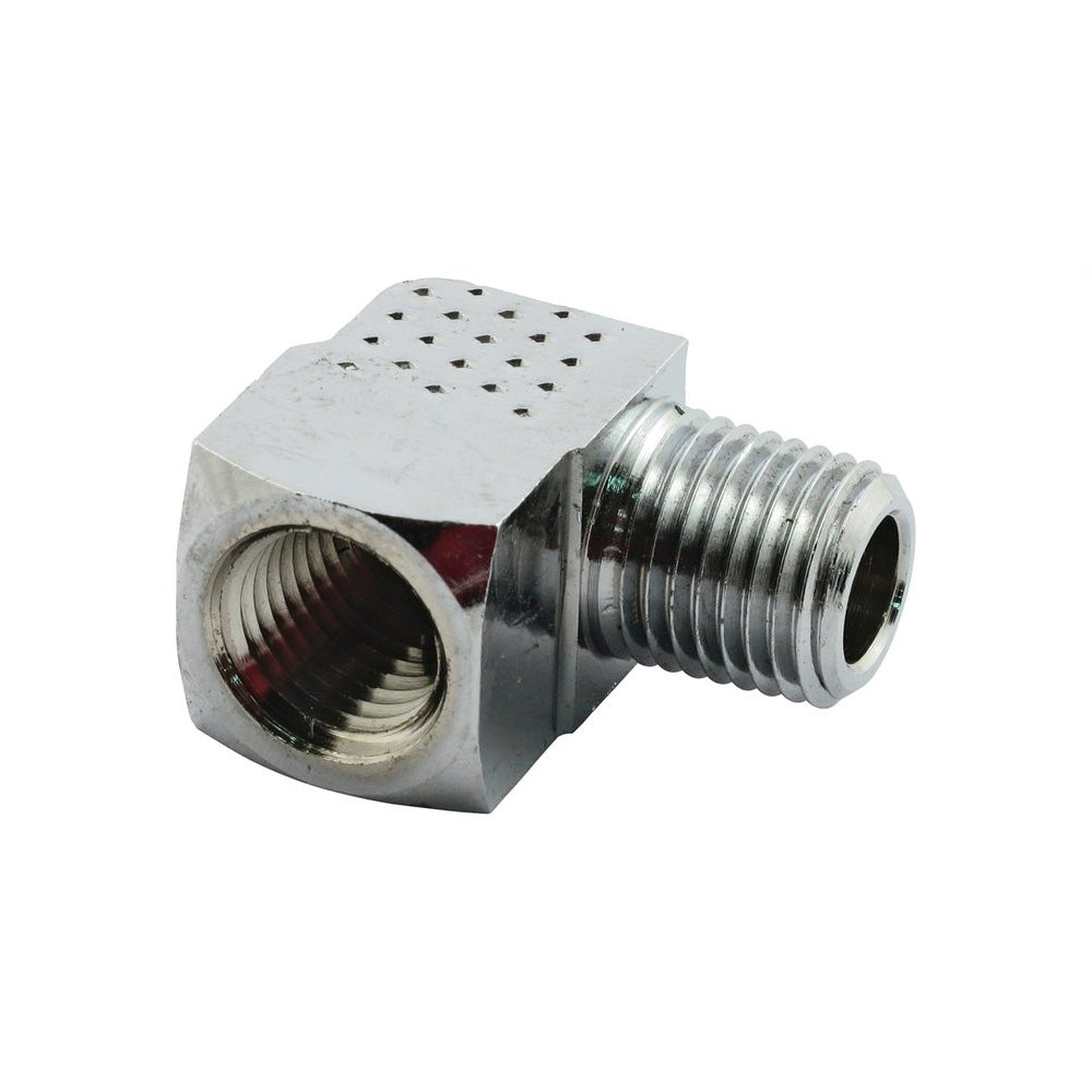 Adapter oil line fitting, 90 degrees. 1/4" NPT. Chrome