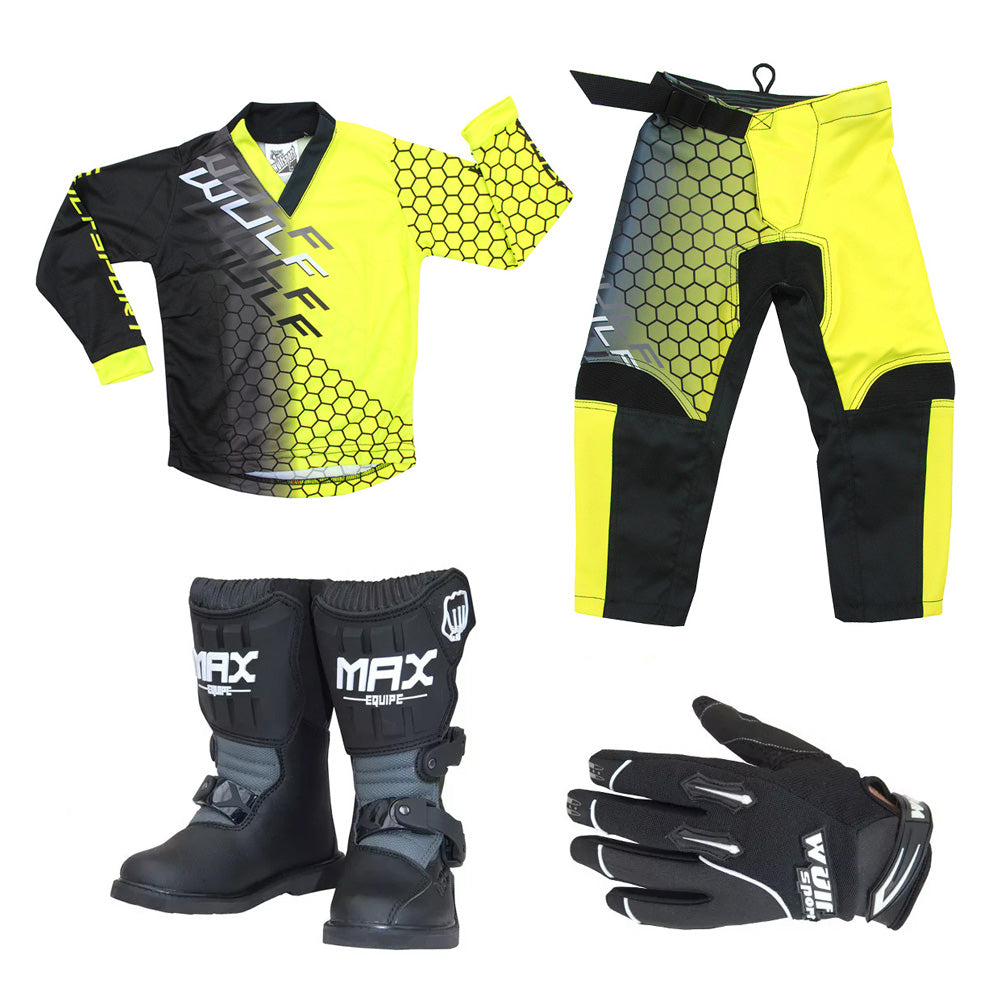 Kids MX Wulfsport 2025 CONNECT Motocross Shirt Pant, Gloves & Boots Yellow Set #M8